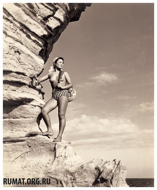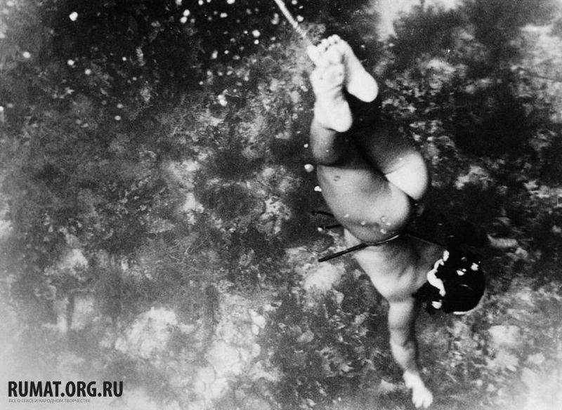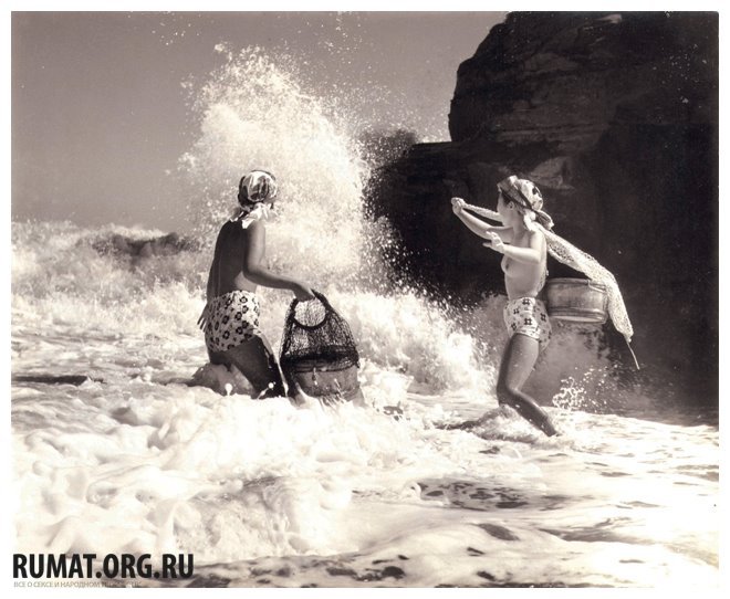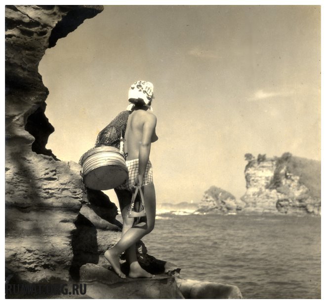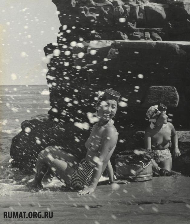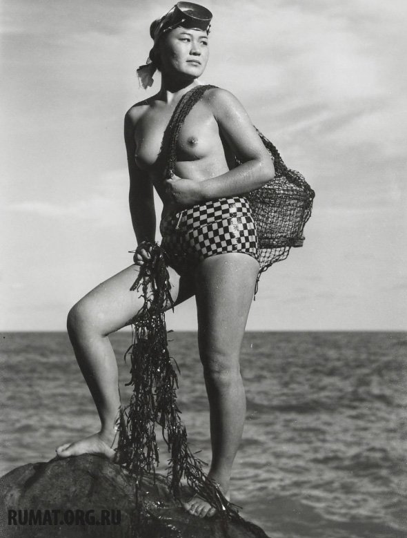 Таковы фотографии Йошиюке Ивасе, его знаменитые ныряльщицы за жемчугом (ama divers). Ивасе родился в 1904 году, в небольшой рыбацкой деревне, на полуострове Чиба, замыкающем Токийский залив с востока. Окончив юридический факультет Университета Мейдзи, он унаследовал семейный бизнес по производству сакэ, но в 1920 году ему подарили одну из ранних моделей камеры Kodak. Он начал фотографировать, и поскольку жизнь деревни в целом была сосредоточена на побережье, именно там он вскоре и обнаружил то (точнее тех), кого ему действительно было интересно снимать: девушек и женщин «ама», собиравших водоросли, раковины и устриц, в которых иногда попадались жемчужины, каждая из которых окупала несколько месяцев работы. Ама выходили в море трижды в день, – а в промежутках грелись и ели у костра, восстанавливая силы. Хороший улов требовал долгих нырков, до четырех минут без воздуха, только на том, что есть в легких. Работа эта была сезонной, но оплачивалась оченьхорошо: за несколько недель ама зарабатывала больше, чем любой мужчина из ее деревни за год.